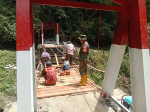 Mandailing Natal, AgaraNews.com // Kodim 0212/Tapanuli Selatan bersama masyarakat kembali melaksanakan kegiatan perbaikan jembatan gantung, kali ini dengan sasaran di Desa Simpang Duhu Dolok, Kecamatan Ulu Pungkut, Kabupaten Mandailing Natal, Selasa (21/4/2026). Jembatan ini sebelumnya rusak akibat diterjang banjir sehingga mengganggu aktivitas warga.Jembatan gantung yang diperbaiki memiliki panjang sekitar 20 meter dan lebar 1,8 meter. Infrastruktur ini menghubungkan Desa Simpang Duhu Dolok menuju Desa Simpang Pining di Kecamatan Ulu Pungkut, yang selama ini menjadi jalur penting mobilitas masyarakat.Dengan rusaknya jembatan tersebut, warga mengalami kesulitan dalam beraktivitas sehari-hari, khususnya menuju lahan perkebunan dan akses antar desa. Oleh karena itu, perbaikan ini diharapkan dapat segera memulihkan konektivitas dan menunjang kembali aktivitas ekonomi masyarakat.Pengerjaan jembatan dilakukan secara bertahap dengan melibatkan personel Koramil 14/Kotanopan Kodim 0212/TS bersama pekerja/tukang dan masyarakat. Adapun tahapan pekerjaan yang telah dilaksanakan meliputi pengecoran pondasi dan blok beton di sisi tepi dekat, pembuatan mal foot plat, perakitan besi, pengecoran foot plat, serta proses pengecatan. Saat ini, pembangunan jembatan gantung tersebut masih terus dikerjakan.Kapendam I/Bukit Barisan Kolonel Inf Asrul Kurniawan Harahap menyampaikan bahwa kegiatan ini merupakan bentuk nyata kepedulian TNI terhadap kebutuhan masyarakat. “Melalui gotong royong antara TNI dan masyarakat, diharapkan perbaikan jembatan gantung ini dapat segera rampung sehingga akses kembali lancar dan roda perekonomian warga dapat berjalan dengan baik,” ujarnya.(Lia Hambali)