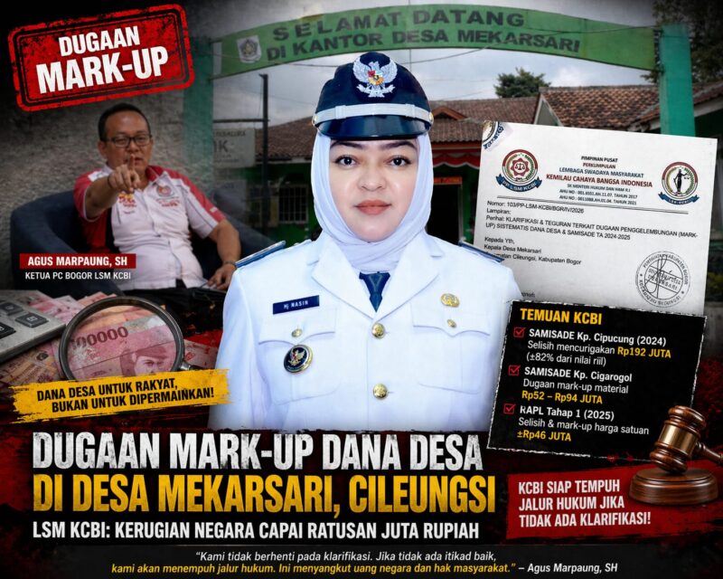 Bogor, AgaraNews .com // Dugaan praktik penggelembungan anggaran (mark-up) kembali mencuat di Kabupaten Bogor. Kali ini, sorotan mengarah ke Pemerintah Desa Mekarsari, Kecamatan Cileungsi, setelah Lembaga Swadaya Masyarakat Kemilau Cahaya Bangsa Indonesia (LSM KCBI) mengungkap indikasi kerugian negara dalam pengelolaan Dana Desa dan program SAMISADE Tahun Anggaran 2024–2025.