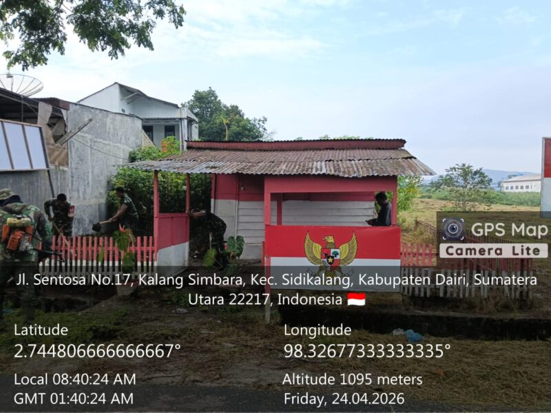 Sidikalang, Dairi — AgaraNews.com// Danramil 02/Sidikalang Kodim 0206/Dairi, Kapten Inf T. Aritonang, memimpin langsung kegiatan gotong royong bersama anggota Koramil dan warga masyarakat dalam aksi bersih-bersih poskamling Kampung Pancasila. Kegiatan tersebut dilaksanakan di Jalan Sentosa, Desa Kalang Simbara, Kecamatan Sidikalang, Kabupaten Dairi, pada Jumat (24/4/2026).