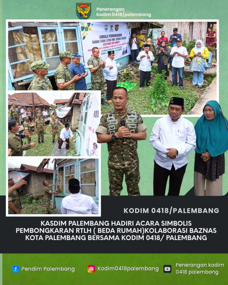 Palembang,AgaraNews.com//Kodim 0418/Palembang berkolaborasi dengan Badan Amil Zakat Nasional (BAZNAS) Kota Palembang melaksanakan kegiatan simbolis pembongkaran Rumah Tidak Layak Huni (RTLH) milik warga bernama Eka Kurniawati, Jumat (24/4/2026).