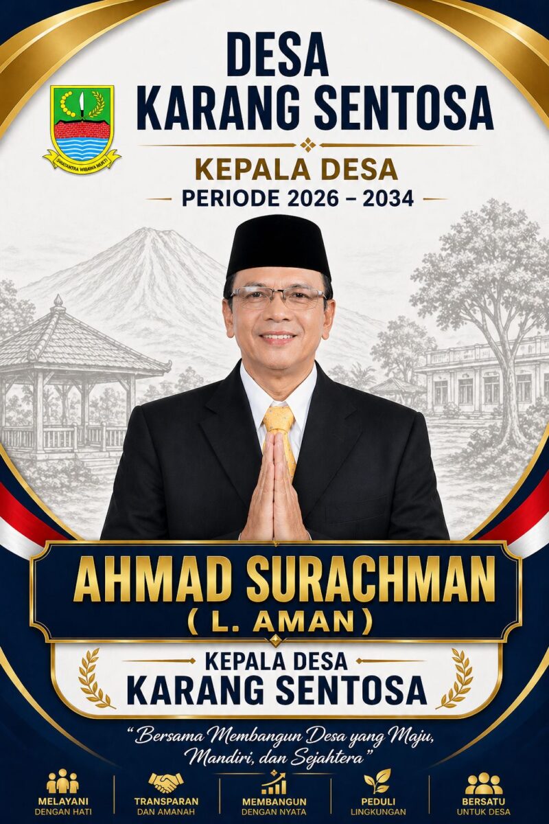 Ahmad Surachman, S. Pd juga memperkenalkan moto “Gebyar Semarak Ganti Kepala Desa Karang Sentosa 2026” sebagai simbol semangat perubahan yang diusungnya.