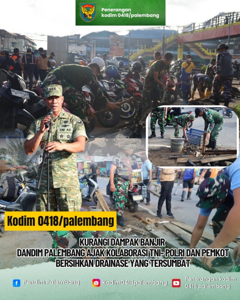 Kegiatan yang dipimpin langsung oleh Dandim 0418/Palembang, Kolonel Arh Erik Novianto, S.sos difokuskan pada pengangkatan sedimentasi dan pembersihan sampah di sejumlah titik rawan genangan. Dandim menegaskan, langkah ini merupakan respons cepat atas banjir yang sempat melanda Kota Palembang dalam beberapa hari terakhir.
