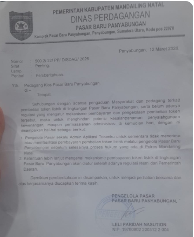 Surat tertanggal 12 Maret 2026yang ditandatangani oleh Pengelola Pasar Baru Panyabungan menyebutkan bahwa penghentian pembayaran token listrik dilakukan karena adanya proses hukum yang sedang berjalan di kepolisian.