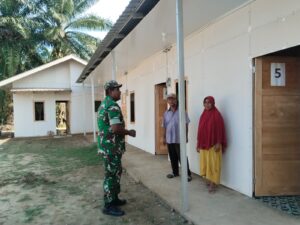 Sambil berbincang santai di depan teras rumah warga, Serda Basyaruddin melaksanakan Komunikasi Sosial untuk mendengarkan langsung keluh kesah serta kondisi terkini para penghuni Huntara. Suasana hangat tercipta saat Babinsa berinteraksi dengan warga, mencerminkan kuatnya ikatan kekeluargaan antara aparat teritorial dengan rakyat binaannya.
