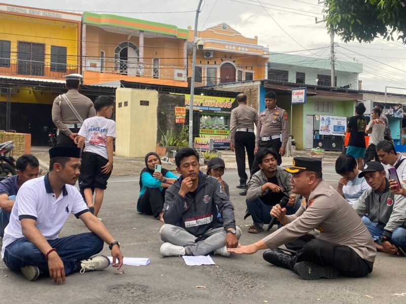Dengan pendekatan humanis, Kapolres memilih duduk bersama di atas aspal untuk mendengarkan dan menerima langsung aspirasi para peserta aksi. Suasana dialog berlangsung terbuka dengan semangat “duduk sama rendah, berdiri sama tinggi”.