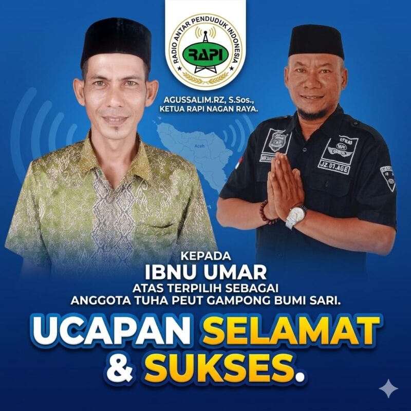 Ketua Radio Antar Penduduk Indonesia ( RAPI) Agussalim.RZ.S.Sos dengan panggilan Callsing JZ 01 AGE mengucapkan. Selamat atas terpilihnya Anggota Tuha Peut Gampong Bumi Sari Kecamatan Beutong Kabupaten Nagan Raya Provinsi Aceh. Minggu,26/4/2026