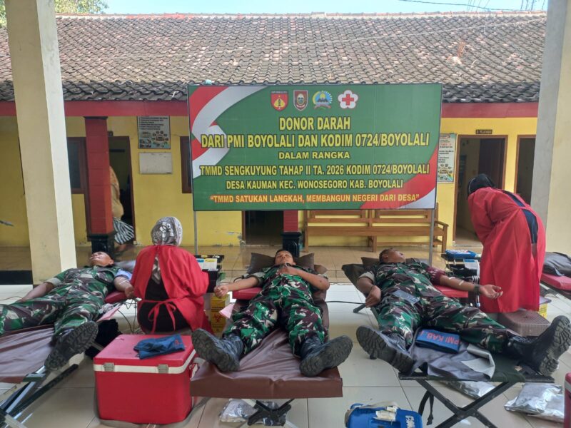 Boyolali,AgaraNews.com//Semangat kepedulian dan kebersamaan kembali ditunjukkan Kodim 0724/Boyolali melalui kegiatan nonfisik dalam program TMMD Sengkuyung. Bersinergi dengan PMI Kabupaten Boyolali, digelar bakti sosial donor darah yang berlangsung di Balai Desa Kauman, Kecamatan Wonosegoro, Senin (27/04/2026). Kegiatan ini menjadi wujud nyata kontribusi TNI dalam membantu sesama sekaligus memperkuat kemanunggalan dengan rakyat.