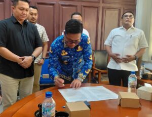 Medan, AgaraNews.com // Wakil Bupati Deli Serdang, Lom Lom Suwondo SS, menghadiri penandatanganan akta pernyataan penyerahan pengelolaan tanah negara yang berasal dari sebagian bekas Hak Guna Usaha (HGU) milik PT PP London Sumatra Indonesia (Lonsum), di Gedung PT Lonsum, Jalan Kesawan, Medan, Senin (27/4/2026).