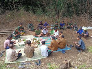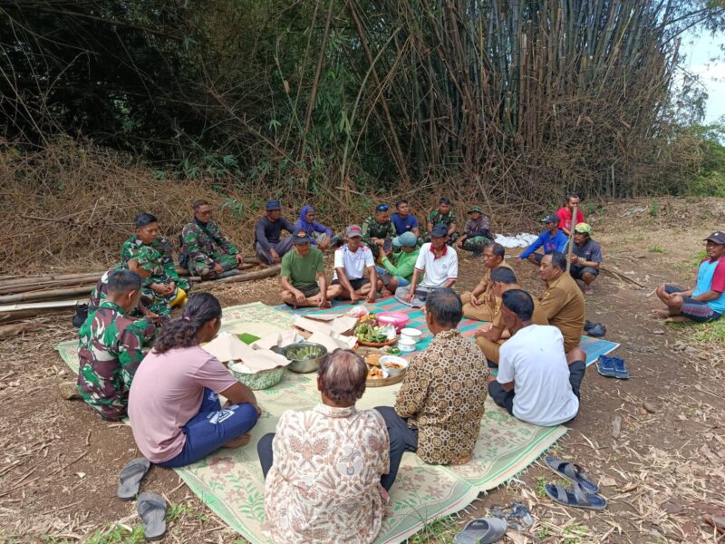 TNI dan warga duduk melingkar bersila dengan beralaskan tikar, ditengahnya terdapat tumpeng dengan lauk pauk bermacam macam, kemudian Sholikin salah satu tokoh masyarakat memimpin doa dan memohon keselamatan kepada Tuhan YME. Selasa, 28/04/2026.