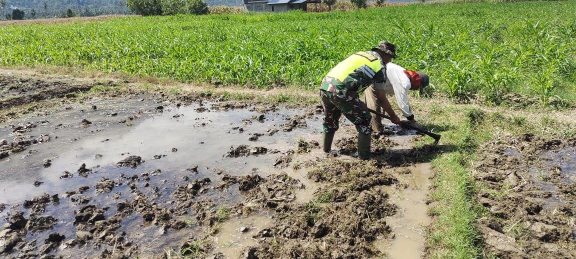 Babinsa Bantu Petani Laksanakan Pembersihan Lahan Bedeng Sawah