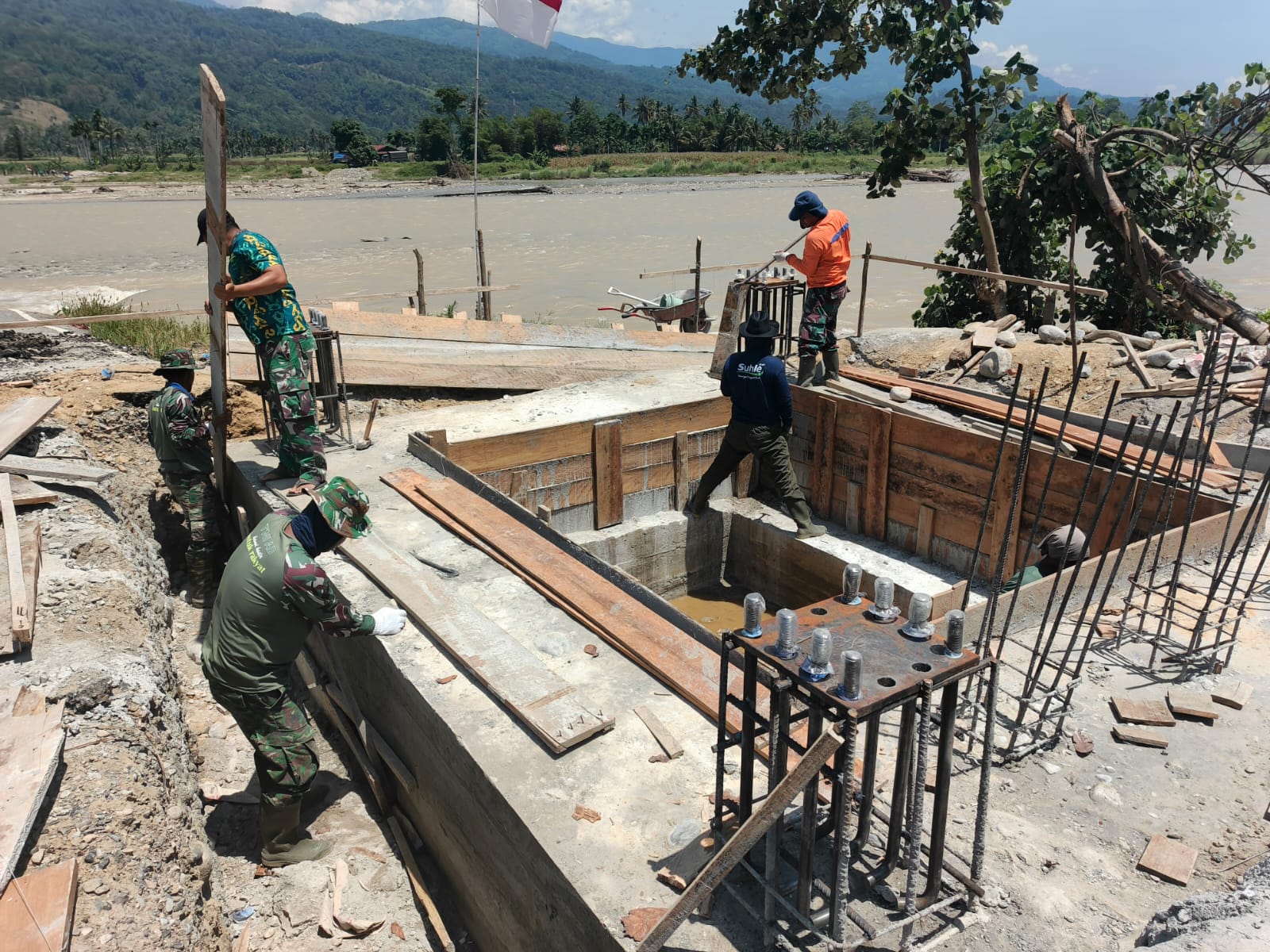 Serma Karmadi menyampaikan Upaya percepatan pembangunan Jembatan Gantung perintis terus dilakukan hari ini personil di bagi dua titik sebagian di desa kumbang jaya sebagian lagi di titik seberang sungai kali alas di desa gulo