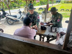 Anggota Satgas TMMD 128 Kodim 0203/Lkt turun langsung ke lapangan dengan melakukan pengecekan kesehatan warga secara door to door. Kegiatan ini dilakukan untuk memastikan kondisi kesehatan masyarakat tetap terjaga selama pelaksanaan program TMMD berlangsung.