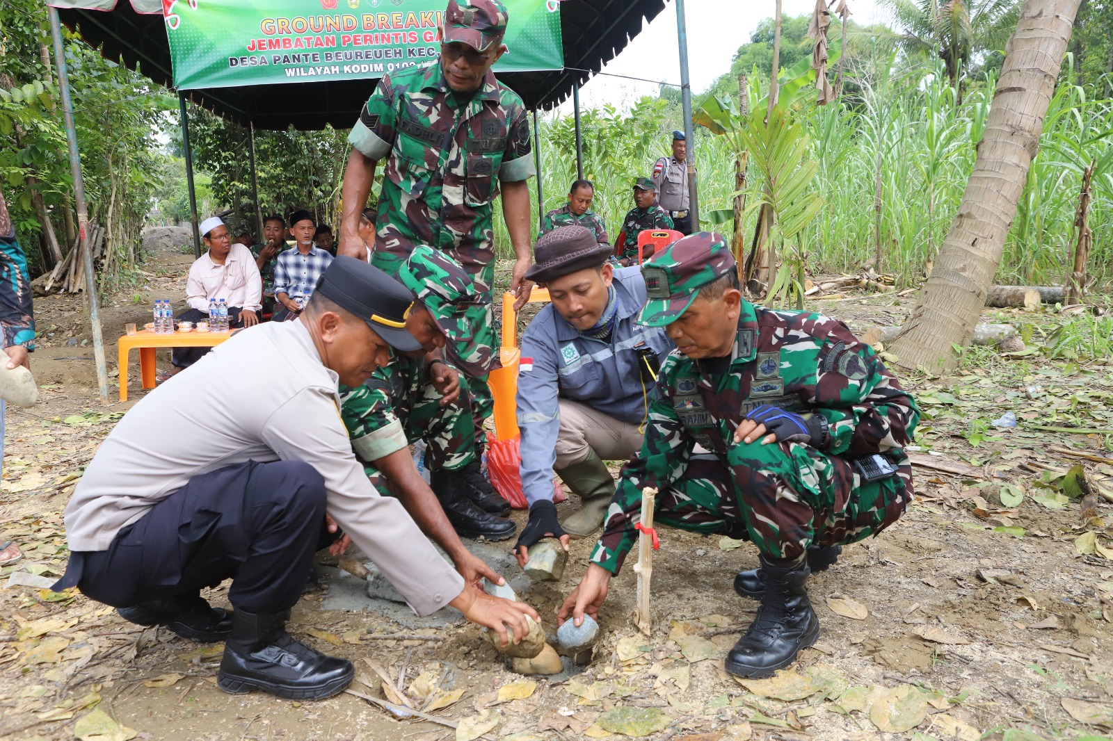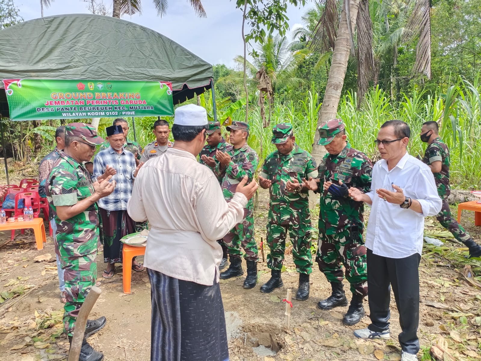 Pidie Agaranews.com – Komando Distrik Militer (Kodim) 0102/Pidie kembali menunjukkan komitmen nyata dalam mendukung percepatan pembangunan infrastruktur di wilayah pedesaan dengan melaksanakan prosesi peletakan batu pertama (ground breaking) pembangunan Jembatan Perintis Garuda. Jembatan ini direncanakan akan menghubungkan Desa Pante Beureueh, Kecamatan Mutiara, dengan Desa Ulee Tutue, Kecamatan Mutiara Timur, Kabupaten Pidie, pada Rabu (29/4/2026).